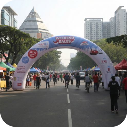 Balon gate fun run tidak hanya berfungsi sebagai dekorasi, tetapi juga menjadi media promosi yang sangat strategis. Logo sponsor yang terpampang besar di balon gate akan mudah terlihat oleh peserta, panitia, penonton, bahkan media peliput. Selain itu, dokumentasi acara yang diunggah ke media sosial akan memperluas jangkauan promosi sponsor secara maksimal.