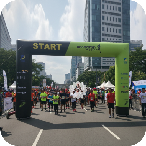 Balon gate fun run cocok digunakan di lapangan terbuka, jalan raya, stadion, maupun area indoor yang luas.